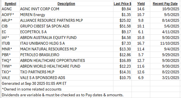 There are some names in both Energy and BioTech that pay high dividends. This is a foot in the water for LOTM as we then have a low risk entry in Energy and Biotech and can use the cash flows to spend in whatever direction we desire. Below are some high dividend names we own or like that have some Energy and BioTech positions: